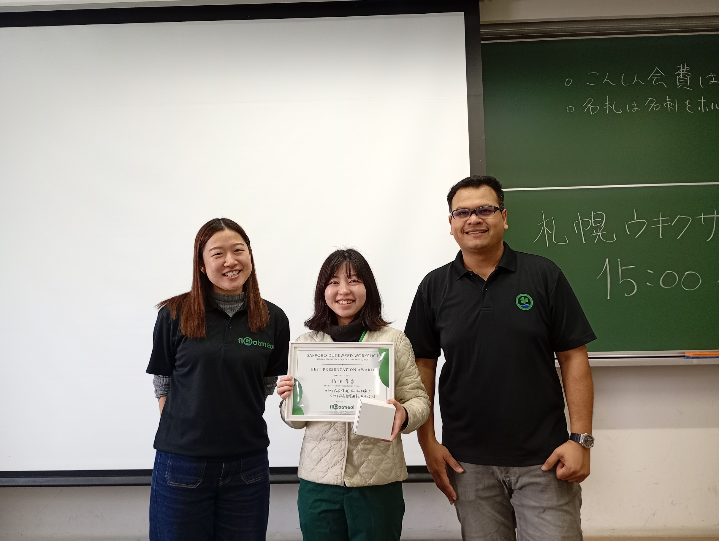 札幌ウキクサ研究会で稲田有香さんのポスターが最優秀発表賞に輝きました。Best Presentation Award was served to Ms. Yuka Inada. 2026. 2. 19-20. 昨年からはじまったウキクサ研究会(於、京都大学)に続き、第二回目ウキクサ研究会が北海道大学で開催されました。稲田有香さんが発表したポスター「ウキクサ成長促進 Bacillus属細菌はウキクサ成長阻害因子も産生している」に最優秀発表賞が授与されました。おめでとうございます。